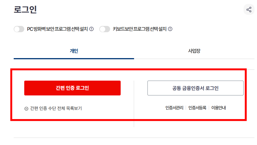 - 공동인증서(구 공인인증서), 카카오톡, 네이버, PASS 등 다양한 인증 방법 중 하나를 선택하여 로그인합니다.