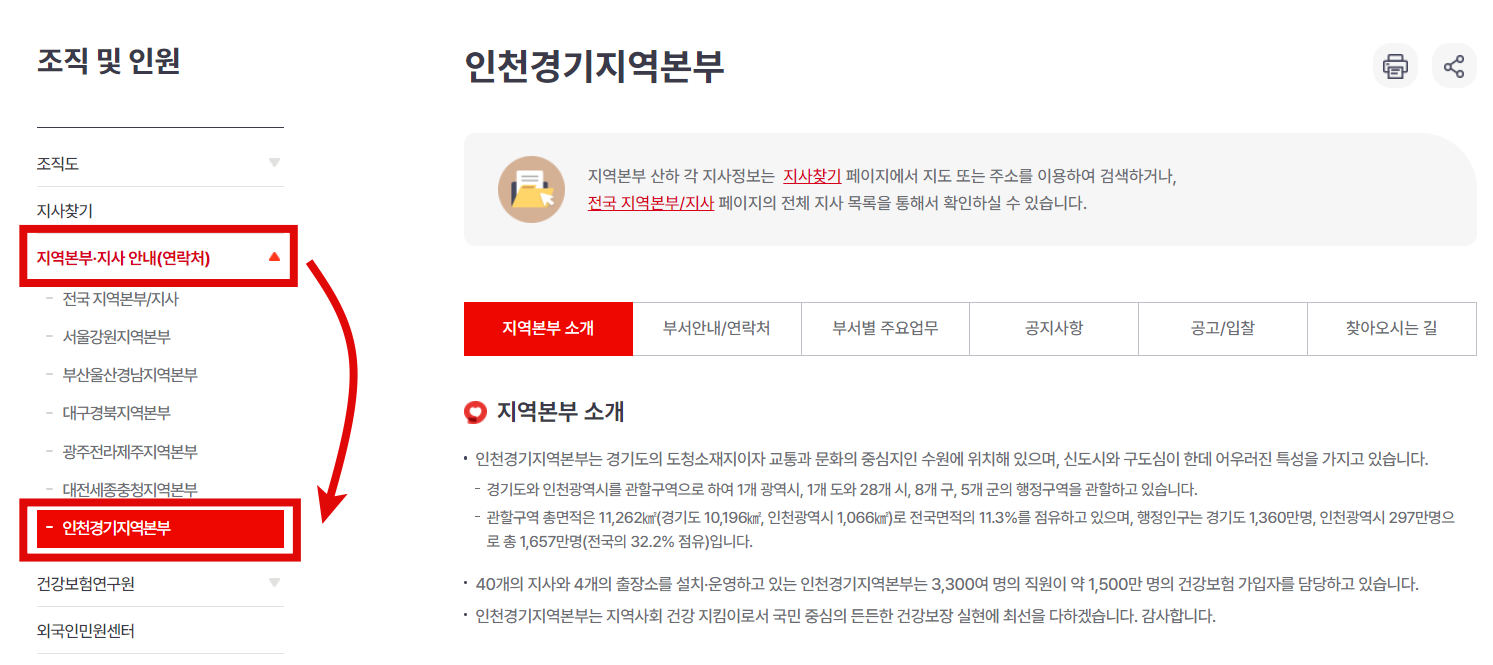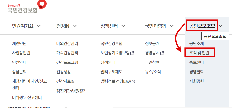 1. 국민건강보험 사이트 접속 > 공단요모조모> 조직 및 인원 접속