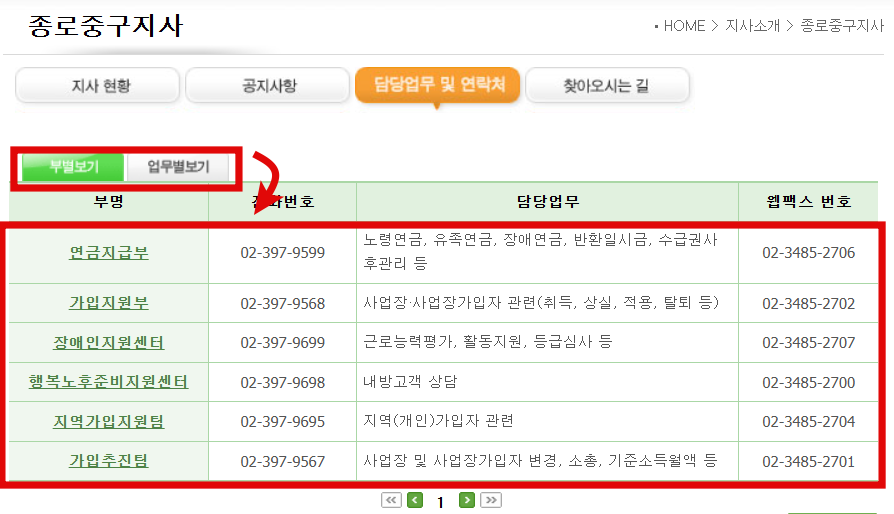 해당 국민연금공단의 담당업무별 연락처 확인도 가능합니다. 담당업무 및 연락처를 클릭하시면 부별로 혹은 업무별로 담당자를 확인하실 수 있습니다.