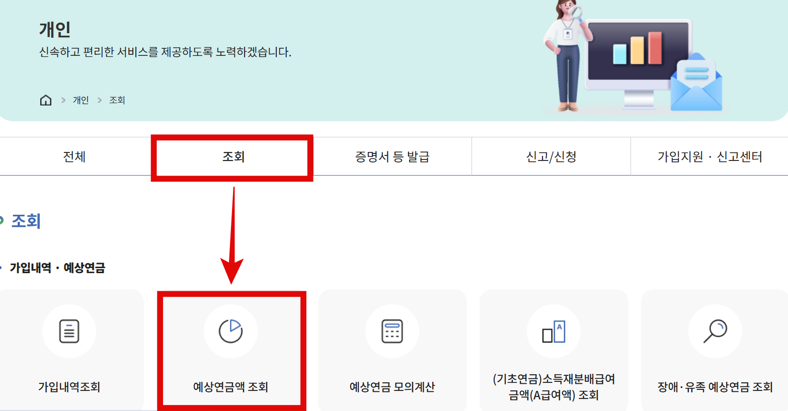 - '가입내역 · 예상연금' 섹션에서 '예상연금액 조회'를 선택합니다.