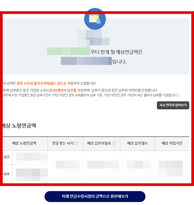 - 예상 연금액은 가입 기간, 납부 내역, 소득 수준 등에 따라 달라질 수 있습니다.