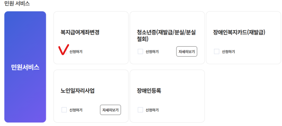 - 상단 메뉴에서 "민원 서비스 신청" → "복지급여 계좌변경"을 선택합니다.