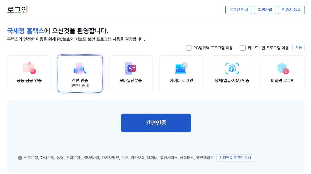 연말정산 대상 여부를 확인하려면 먼저 국세청 홈택스에 로그인해야 합니다 공동인증서 금융인증서 외에도 카카오 네이버 PASS 등 간편인증을 지원하기 때문에 PC나 모바일 환경 모두에서 어렵지 않게 접속할 수 있습니다 본인 인증이 완료되어야만 개인의 소득 정보와 연말정산 자료를 조회할 수 있습니다