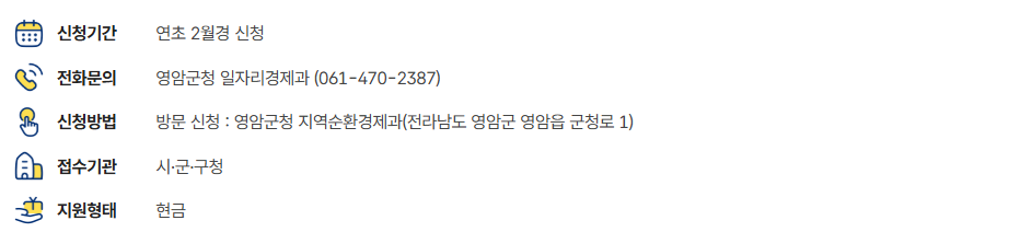 지원 자격이 된다면 지금 바로 서류를 준비해 군청 방문 신청을 진행해보세요. 자세한 사항은 영암군청으로 문의하면 친절하게 안내받을 수 있습니다.