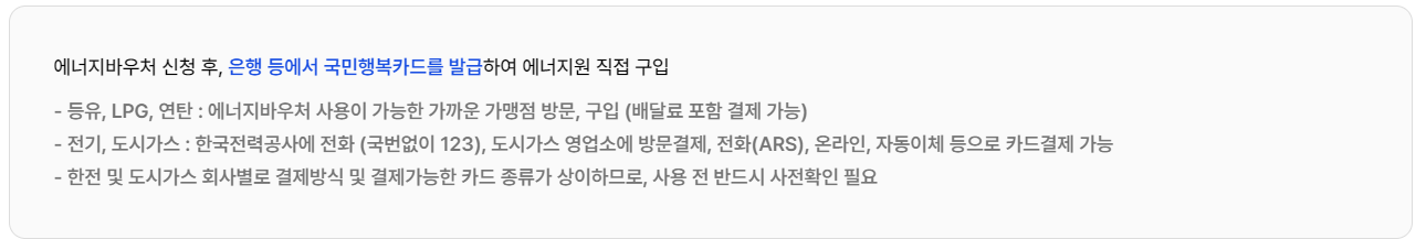 - 카드 발급: 에너지바우처 신청 후 은행에서 국민행복카드를 발급받습니다.