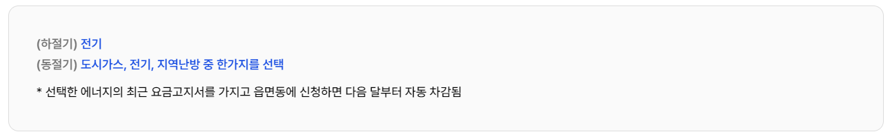 - 자동 차감: 신청 후 다음 달부터 선택한 에너지의 요금이 자동으로 차감됩니다.