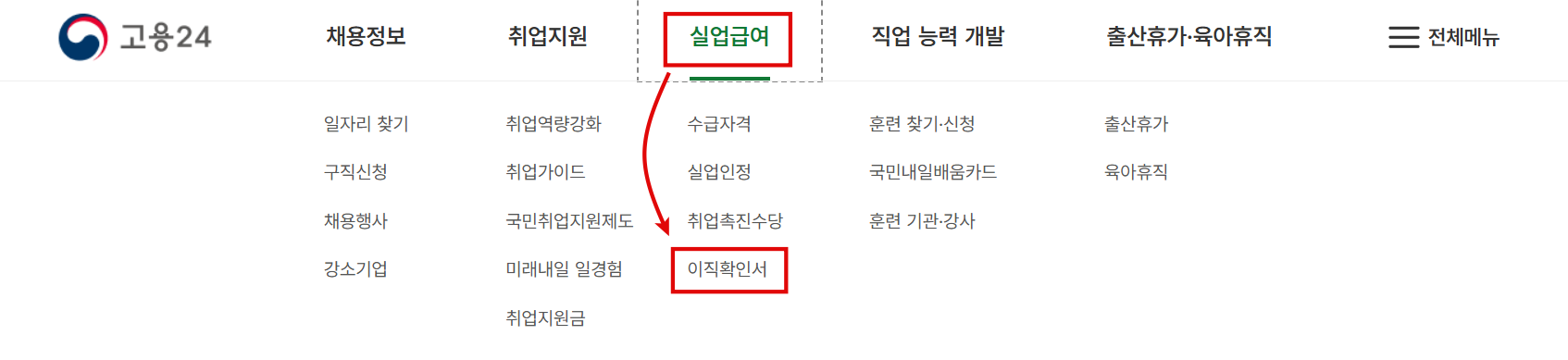 - 상단 메뉴 → 개인서비스 > 조회 → 이직확인서 처리여부 조회